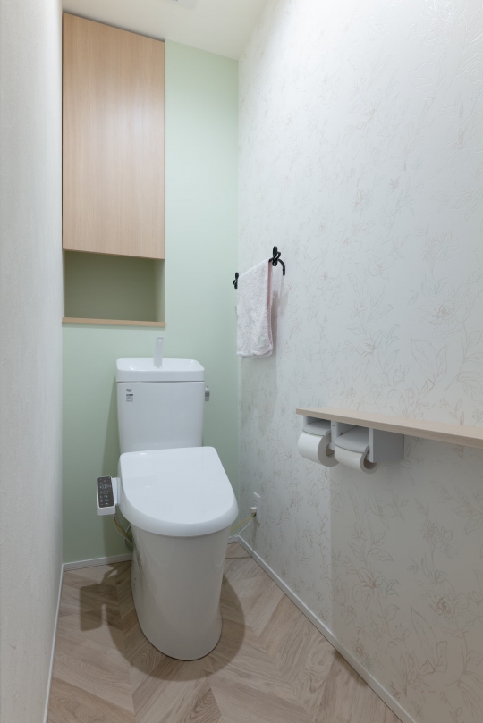 家族3人と1匹の新しい生活がスタートする、理想のお住まい。カラフルなグリーンやブルー、オレンジを取り入れながらも、色彩の調和を大切にし、どこか統一感を感じさせるデザインに。オークやラタン、框のデザインが可愛らしさを引き立てつつ、ノルディックカフェ風の落ち着いた空間が完成しました。