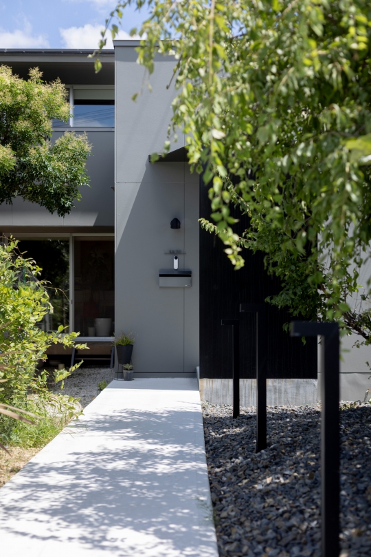 駐車場から玄関までのアプローチは、既存の植栽を活かして計画。ライトで誘導する動線も新たに設けました。