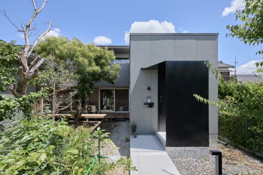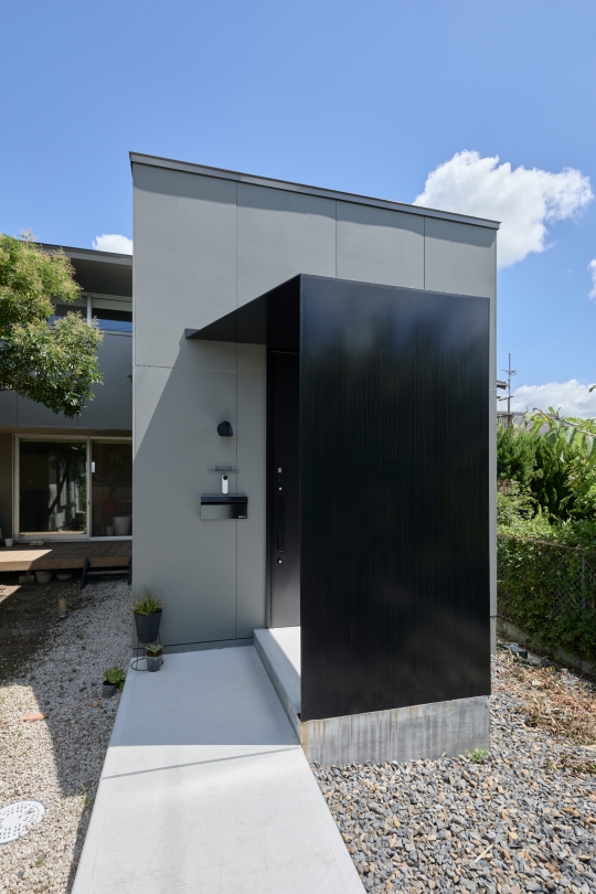 新しい玄関は道路側に設け、家族の行き来がスムーズに。造作の庇(ひさし)で目隠しをつくり、外観はホワイトからスモーキーグレーに美しく刷新。まるで新築のような顔立ちに生まれ変わりました。