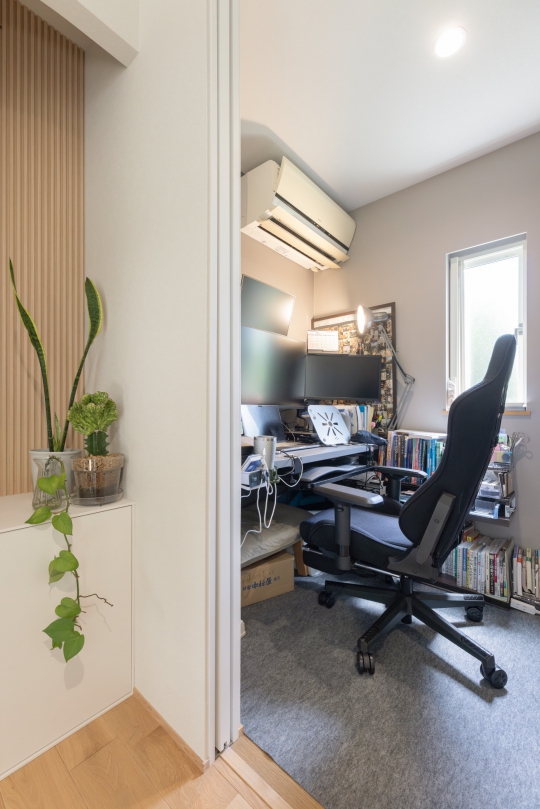 1階に設けた書斎は、リビングと距離をとることで集中しやすく、在宅ワークに最適な空間。
