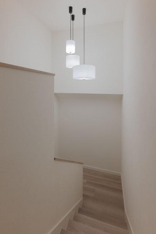 ご両親との同居を見据え、家全体をフルフラットのデザインで計画し、家族それぞれが快適に過ごせる間取りを実現。断熱性の向上や家事動線にもこだわり、機能性にも優れています。白とグレーを基調としたシンプルでスッキリとしたデザインながらも、高級感を感じさせる仕上がりとなりました。