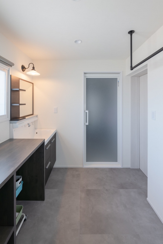 洗面脱衣室もリビングとテイストを揃え、壁面の一部を躯体現しに仕上げました。室内物干しはガス管を取り入れ、カッコよさを演出。