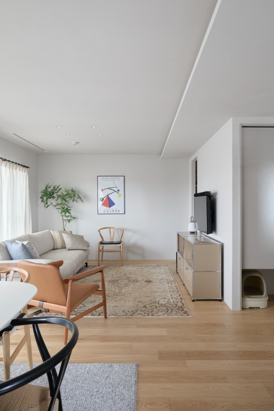 大きく間取り変更したのはLDK+WIC部分。家族と自然に顔を合わせる機会が増えるように、キッチンはリビングの中心を向くように配置しました。ナチュラルな木目と白でまとめた柔和な雰囲気を纏う空間が、豊かなコミュニケーションを育みます。
