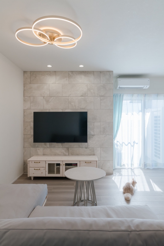 TVボードの背面に位置する壁面をセラミックコンクリートで塗装。たった一部分デザインを変えることで、空間の印象をランクアップしてくれます。
