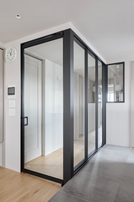 住まいのテーマは『揃える』。色や素材、ラインを統一することで、空間がスッキリとし、部屋が広く見える効果を演出しています。角部屋ならではの明るさを取り入れ、シンプルながらもタイルや塗装など素材感にこだわったお住まいになりました。