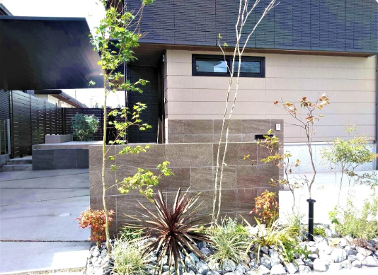 外構の顔となる門柱は大判タイルで重厚感を漂わせております。