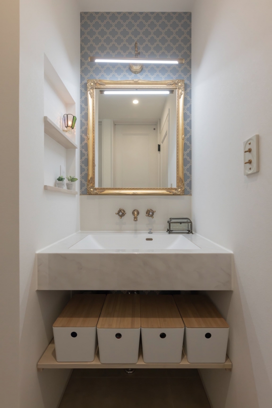 アールのデザインが随所に散りばめられ、どの角度から見ても目を惹く美しさ。キッチンや洗面、扉などにも曲線を描き、空間に統一感を持たせながら色味で華やかさを添えました。間接照明を巧みに使い、温かみと柔らかさを表現。さらに動線に沿った収納を計画することで、毎日の暮らしにゆとりをもたらしました。
