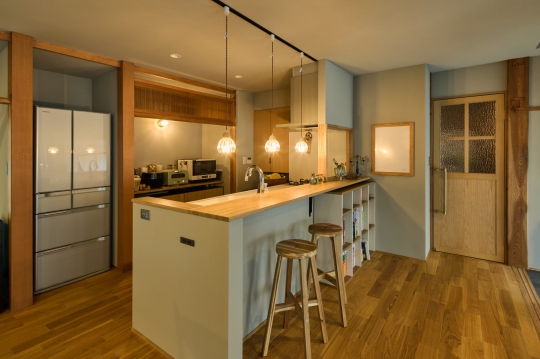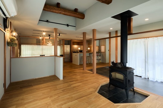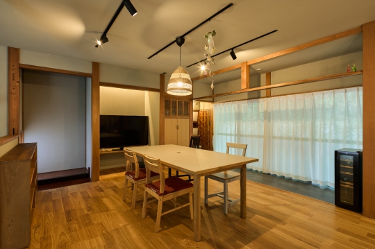 柱や梁をそのまま再利用し、古民家ならではの風合いを最大限残しつつ、現在的な意匠を織り込んだ施工事例。新築では決して出すことのできない、経年変化の美しさを感じることができる、落ち着いた空間が完成した。デザイン性だけでなく、断熱性の高いサッシを使用するとともに外断熱を施し、住み心地も向上させている。