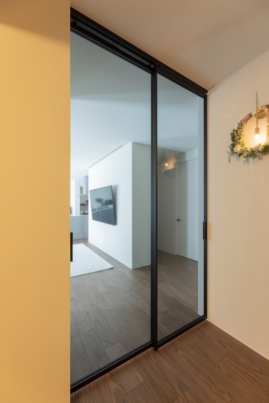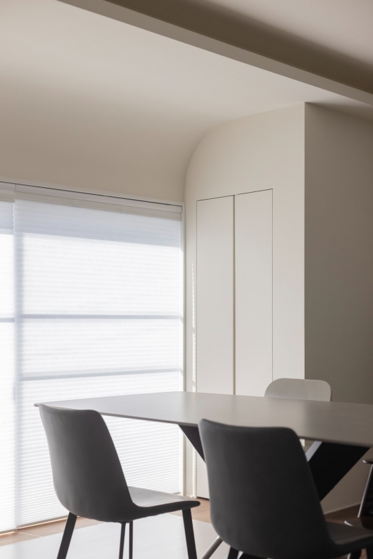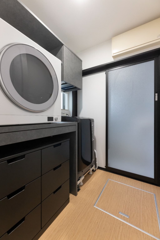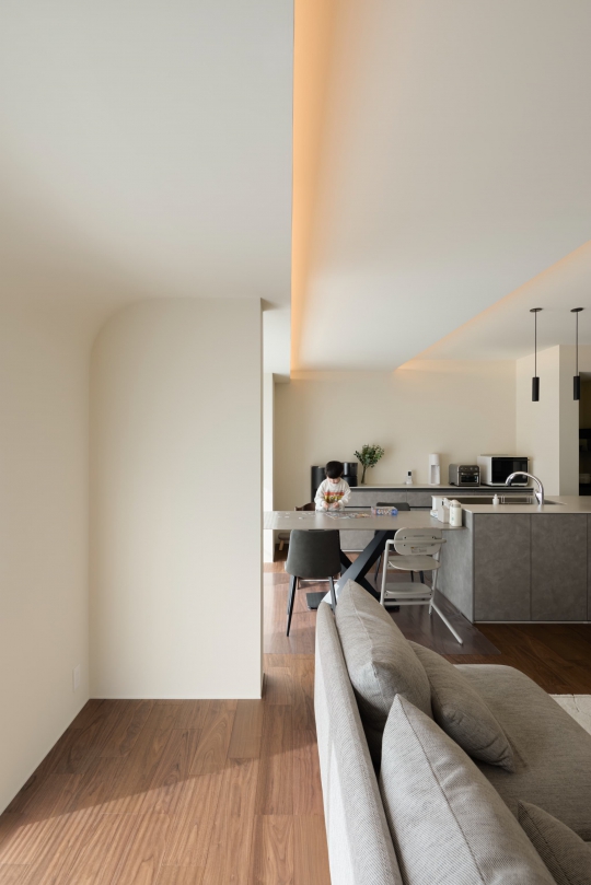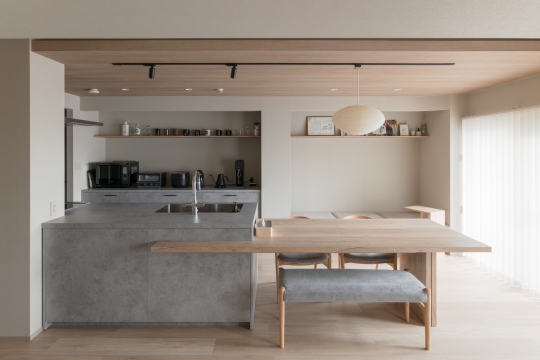 落ち着いた色彩に石目調のキッチンやブラックのアクセントを配し、和に寄りすぎないクールな佇まいに。丁寧に設えた造作家具が洗練された印象を際立てます。リビングのヌックには柔らかな曲線を取り入れ、直線的な美しさに軽やかな動きをプラス。お気に入りの洋服や靴がすっきり収まるよう、生活感を見せない収納計画で空間の心地よさを保ちました。
