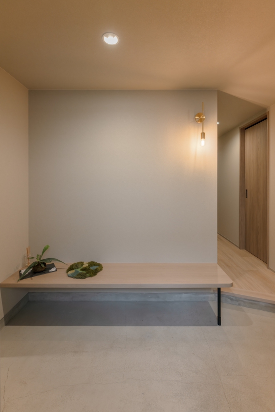 木×コンクリートの異素材が上手く調和した、決して飽きの来ないデザイン。彩度を抑えた落ち着きある空間を、フレッシュなグリーンが豊かに彩ります。自然を通じて、日常に癒しや安らぎの時間をもたらしました。