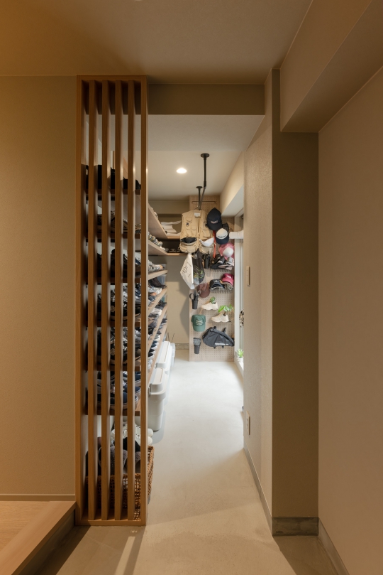 玄関土間を広く計画し、キャンプやスノーボードなどのアウトドア用品をまとめて収納できるスペースを設けました。屋外で使って汚れが気になるアイテムもそのまま土間に置くことができ、掃除もしやすいのでいつでも清潔な状態を保てます。