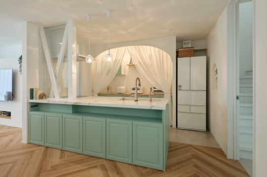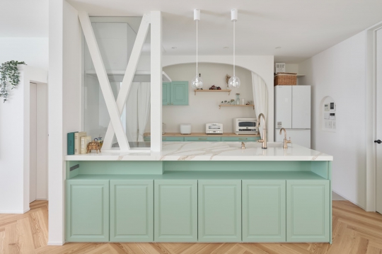 玄関を開け、真っ先に目に留まるのがLDKの中心に据えられたアイランドキッチンだ。ブルーグリーンに塗装されたアイランドキッチンは、ダイニングと一体型の天板がポイント。かわいらしい陶器の取っ手や、輸入風の水栓を取り付け、世界の一つだけのキッチンを演出した。
