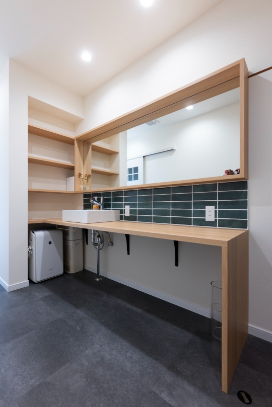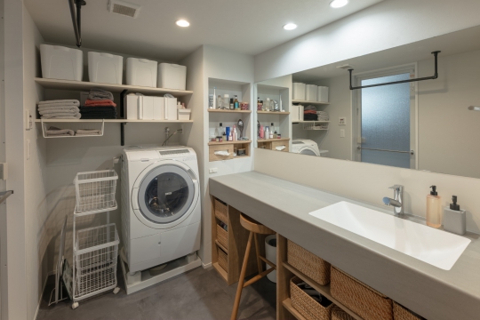 できるだけ無駄のない動きになるように洗面室に設けた2つの出入り口は、廊下からの生活動線とキッチンからの家事動線を短縮化。朝起きてからの一連の動きも一段とスムーズに。