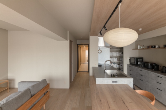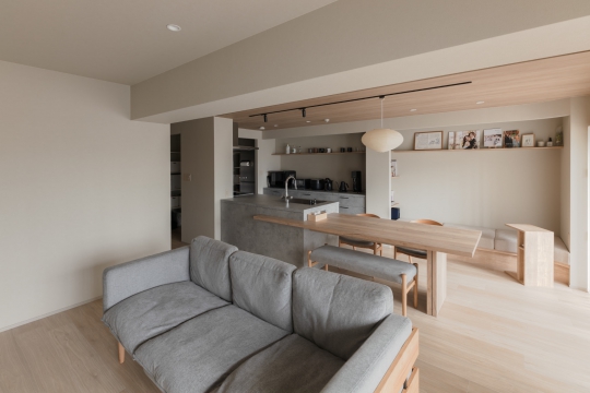 ライフスタイルの変化に合わせ、1人でも2人でも、家族と一緒でも快適に過ごせる住まいへリノベーション。 LDKを中心に、仕様や色味を見直し、ナチュラルテイストに仕上げました。造作風のヌックやこだわりの収納スペースは、コストを抑えながらもデザインの統一感を大切にし、心地よい空間を実現しています。