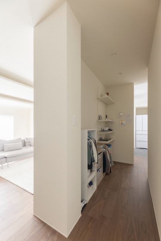 廊下からLDKにかけての天井はマンションのコンクリート躯体に白塗装を施し、壁にはクロスではなく塗り壁にし、少し武骨な印象も持たせている。