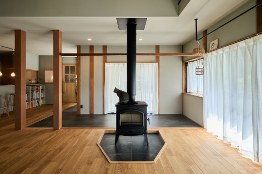 古民家を自然素材で快適に暮らせる住まいへと再生。既存の建物を活かした大胆な間取り変更と自然素材の導入により、開放感あふれる空間を実現しました。柱や梁、欄間などの伝統美と、薪ストーブや造作洗面台などの現代要素が融合した、快適性の高いお住まいです。