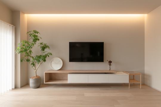 LDKのヌックと小上がりが連続した造作家具は、オーク無垢材を使用して素足でも心地よく。TVボード裏にはちょっとした籠り空間があり、将来お子さまのワークスペースにも最適です。間接照明が無垢材の風合いとタイルの質感を引き立て、壁や天井に美しい陰影を描きます。