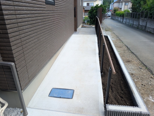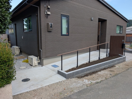 アプローチにはスロープ+手摺を配置し、安全性にも配慮しました。
