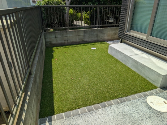 お庭のスペースは人工芝、車庫スペースは洗い出しコンクリートで仕上げました。