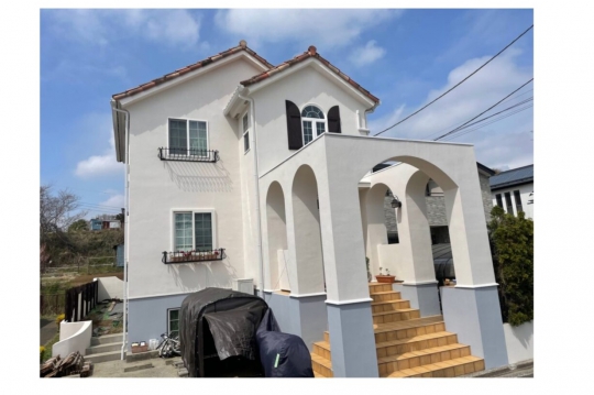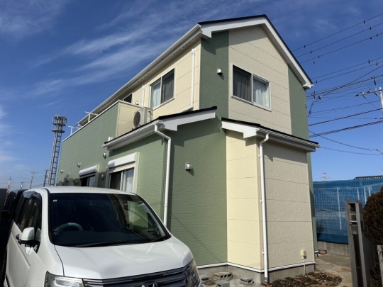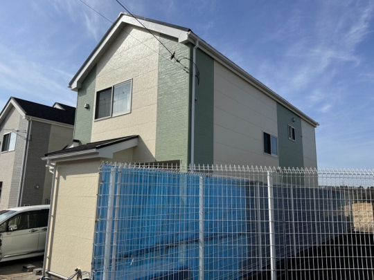 【外壁】メーカー:シーカ・ジャパン 使用材料スーパーセランフレックス 色:ライトクリーム(アステック色8096)艶有 フレンチグリーン(アステック色8105)艶有