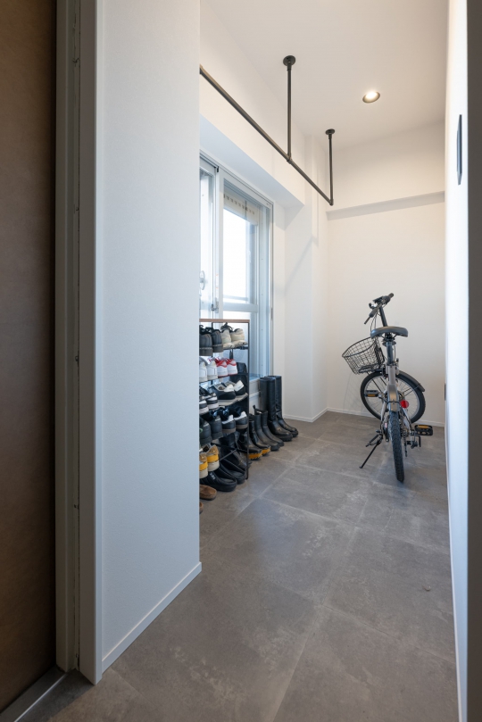 注目ポイントは、開放感あるLDKと土間空間。廊下を設計せず、玄関とリビングの間の壁をなくして段差を設けたLDKは、他の空間との繋がりは感じながらも独立感とメリハリが生まれました。また、玄関とLDKの一部に広くとられた土間空間は、フレキシブルに活用できるので、暮らしに変化をもたらします。