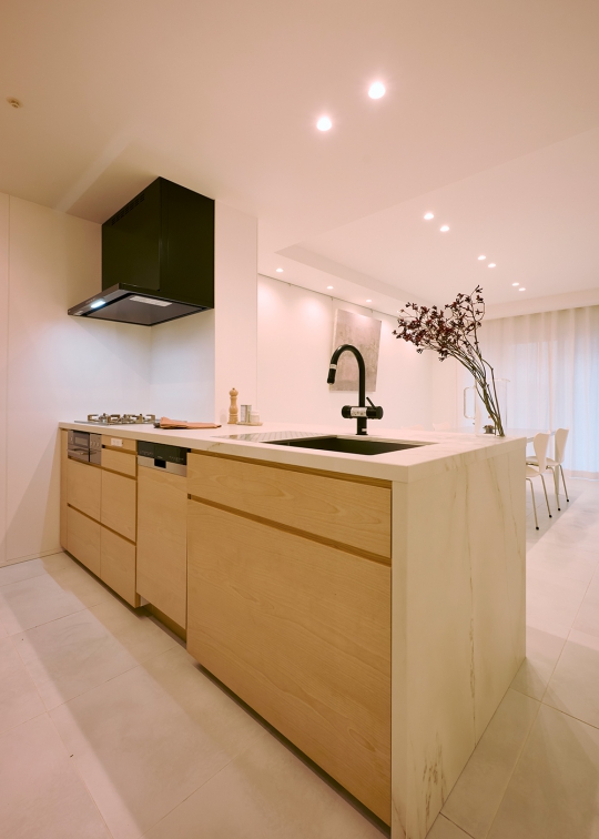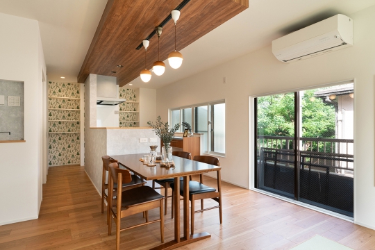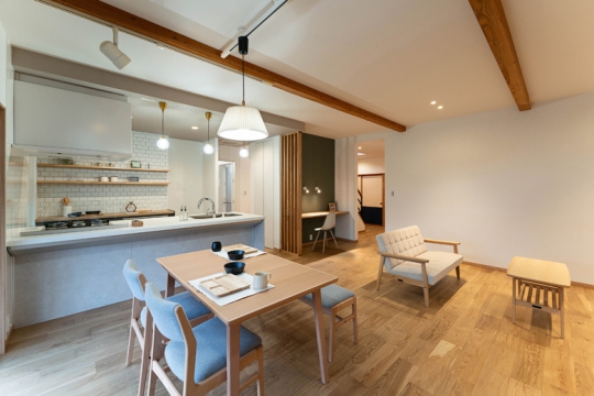 壁を取り払い、光と風が抜ける開放的なLDKを実現。無垢材やタイル、間接照明など、素材やディテールにもこだわることで、住まう人の感性に寄り添う空間に仕上げます。