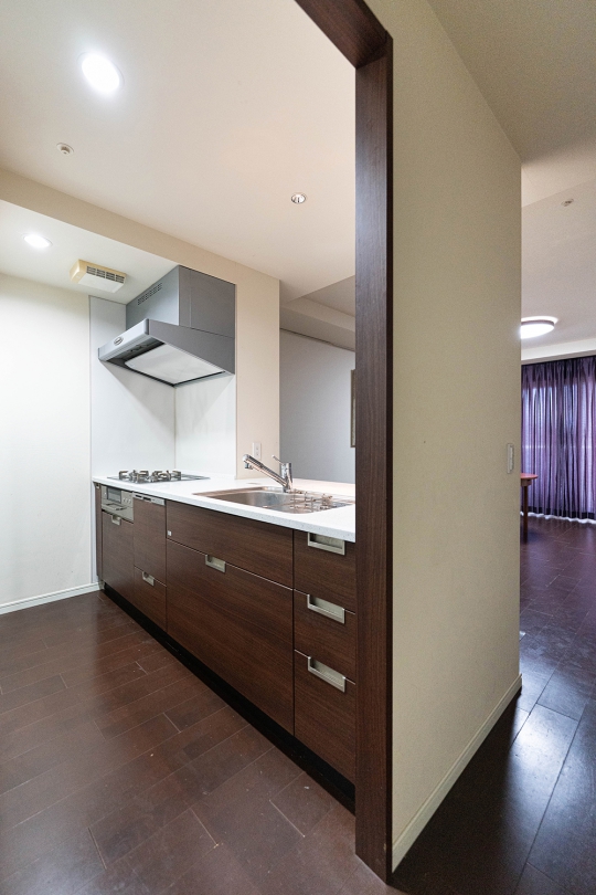 (奥様)キッチンも通常よりも広めにしてもらったおかげで、キッチンとカップボード両方の扉を開けてもぶつからないですし、後ろに人が通っても楽に通れます。