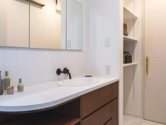 キッチンはグラフテクト。オーダーの洗面台は三面上の収納部分を壁に埋め込みすっきりと。