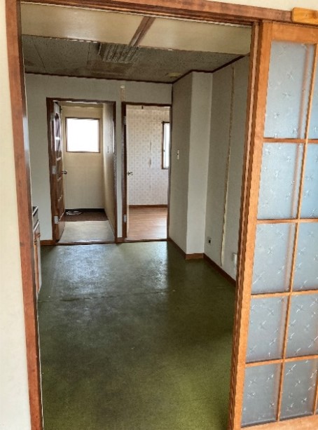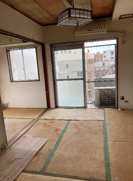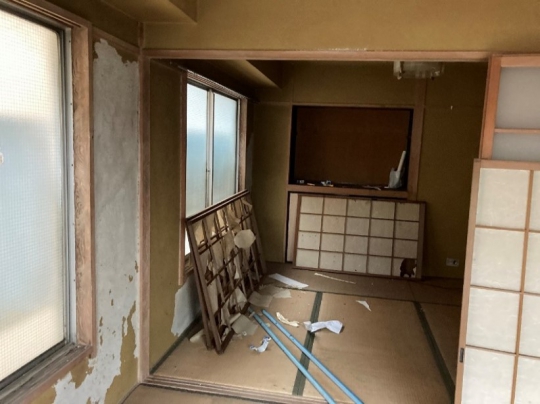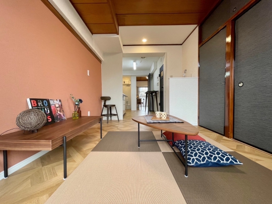 手前のガラス入り引き違い戸と壁を取り払い、手前の畳だった部屋とつなげてLDKにしました。