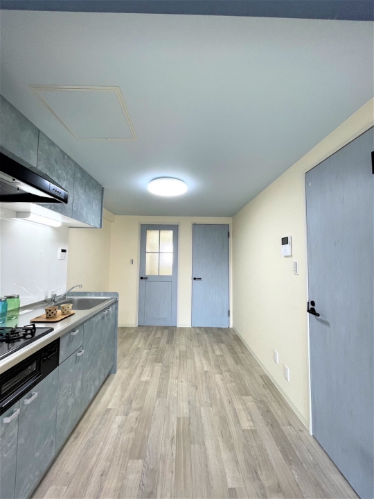 建具はブルーグレーの物を選定、天井のクロスも薄いブルーにして、全体的にさわやかな印象になりました。