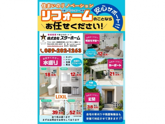 | 対応可能リフォーム | 全面リフォーム / 塗装リフォーム / 内装リフォーム / エクステリアリフォーム / 水回りリフォーム |