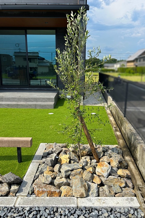 フェンスや塀を使わず、駐車場から庭を広々と見せたデザイン。ベンチは庭のアクセントにもなっています。人工芝を設置し、メンテナンスもしやすいお庭です。外観に調和する外構デザイン事例。天然石や人工芝、シンプルながら温かみのあるエクステリアを実現。さらにシンボルツリーを植栽し、天然石をあしらうことで、自然の温もりを感じられる空間を演出しました。