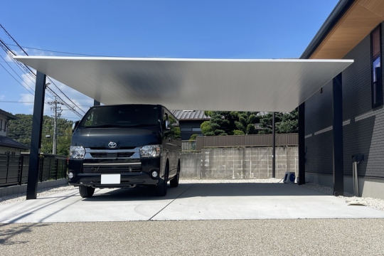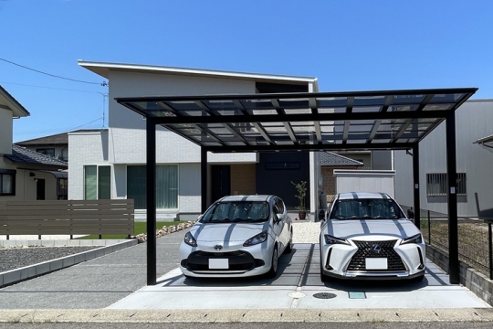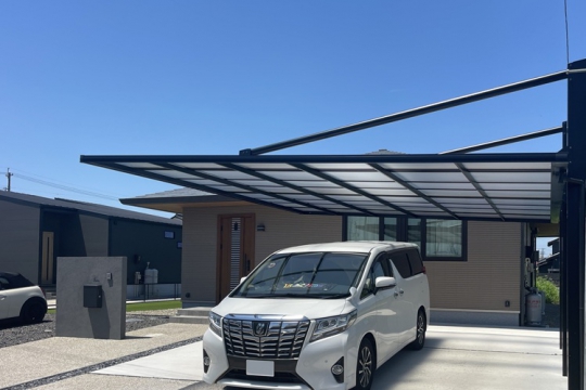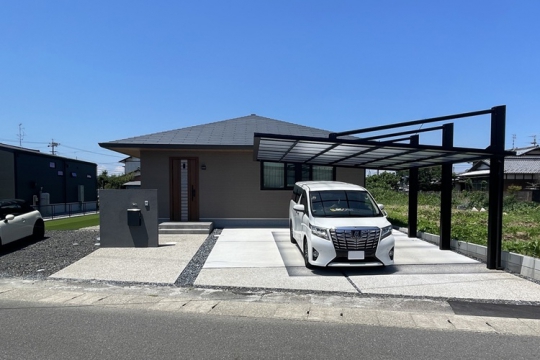 モダンな平屋住宅に合わせた外構デザインです。大開口の窓からつながる庭、使いやすい駐車スペースを兼ね備えたエクステリアをご提案。 駐車スペースには、大型車もゆったり収まる片支持タイプのカーポートを設置。外観デザインと調和するフラットな屋根形状が、スタイリッシュな印象を与えています。アプローチは、曲線を描いたデザインが住まい全体をやわらかく演出します。