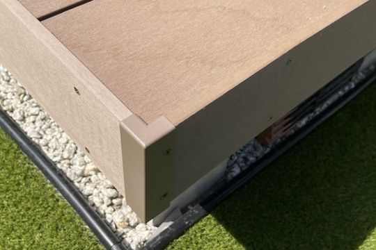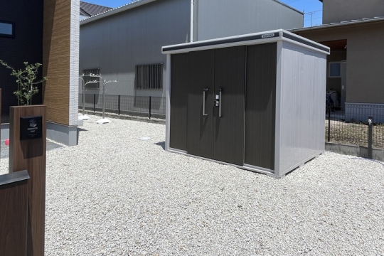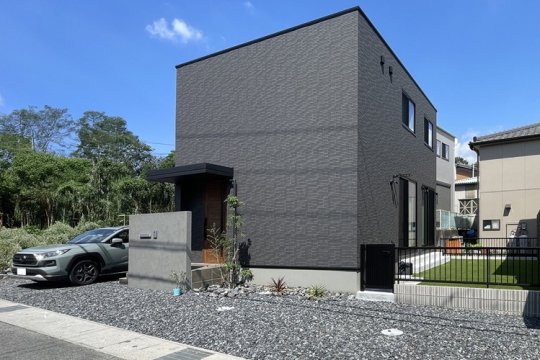 暮らしやすさと安心感、さらにデザイン性を兼ね備えた外構を実現。庭部分には人工芝を敷いて日々の草むしりや水やりを不要にし、砂利敷きによって雑草対策と防犯性を強化。門柱は視線を程よく遮りながら防犯面効果も。住まいに安心感をプラスしています。外観はシンプルでモダンなデザインにまとめることで、上質さとスタイリッシュな印象を両立。