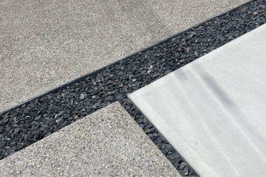 シンプルな直線美と奥行きを感じさせる外構デザイン。建物のデザインに調和するように設計された奥行き感のあるアプローチが特徴です。堀の内側にはプライベートガーデンスペースと人工芝と白い砂利を組み合わせたメリハリのあるガーデニング空間にいたしました。塀の外側はこれからオーナー様で植栽をされる予定です。アプローチには洗い出し仕上げを。訪れる人を楽しませる仕掛けを盛り込んでいます。