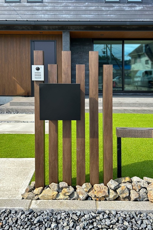 古くなった竹垣を新しくリフォームし、アプローチやデザインウォール植栽などをリノベーションしました。重厚感のある素材を使用しましたが、風通しが良さそうな設置デザインで蒸し暑い夏も日陰と風が通り機能性も優れたデザインです。
