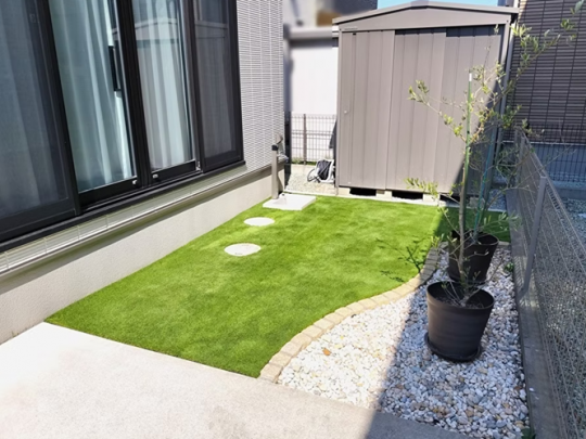 お庭の方は、天然芝から人工芝に変更し、お手入れのかからないお庭にしました。
