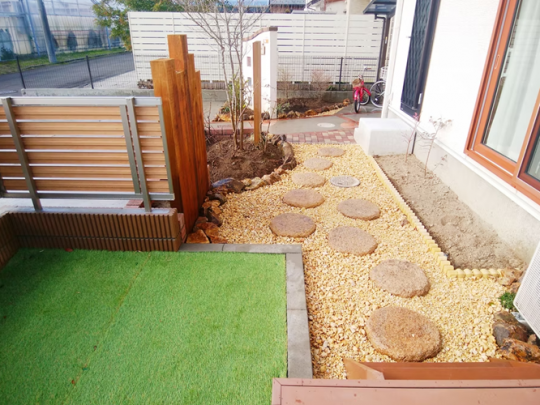 化粧砂利で雑草対策もして、お手入れの簡単なお庭へとリフォームしました。