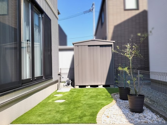 仙台市 外構工事|人工芝のお庭と駐輪スペース
