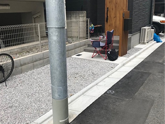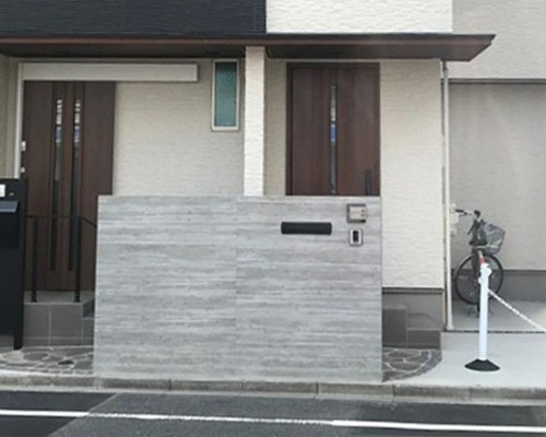 道路に面した玄関の丸見え状態を改善するため、幅の広い門柱を設置
