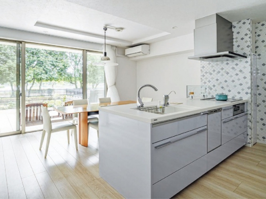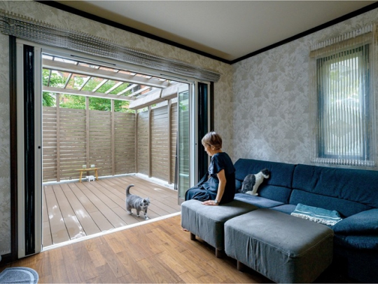 リビングの掃き出し窓をフルオープンサッシに替え、目隠しを設けたウッドデッキを新設。愛猫も人も安心してくつろげる外空間を実現しました。また、独立型キッチンをオープンキッチンに一新。デッキまで見渡せ、愛猫が自由に家の中を行き来できるキャットトンネルも叶えています。