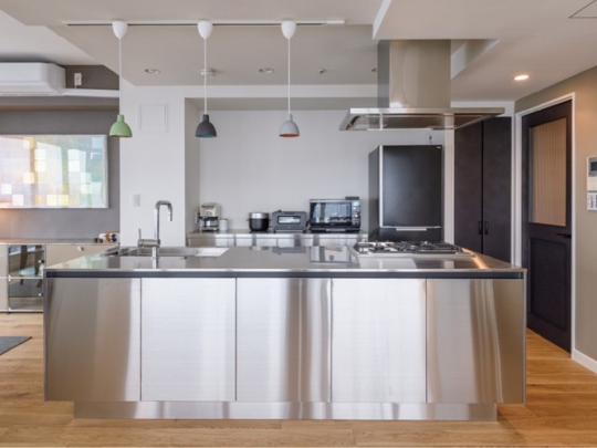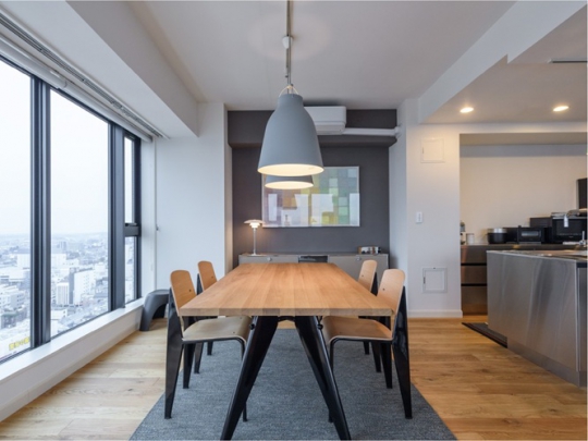 家族構成に合わせて3LDKの間取りを2LDKに変更。広々と生まれ変わったLDKは高層階ならではのスカイビューが思いきり楽しめるようになりました。壁を取り払い開放的になったキッチンは、こだわりのオールステンレス。風合い豊かなオークの床材、北欧モダンの名作家具や照明を合わせ、理想の空間を実現されました。