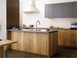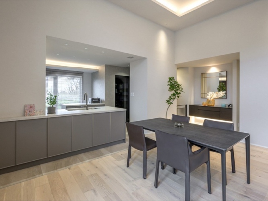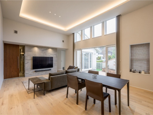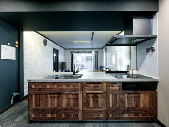 住まいの雰囲気を一新したい、LDKを広げたいというご要望。そこで、勾配天井だったLDKは三角フォルムを脱却し、折り上げ天井と間接照明をご提案。さらにキッチン奥にあった洋室を取り込み、広がりを生み出しました。光の演出、挽板フローリング、タイル、ハイドアなど、モダンに変わったインテリアにご満足いただいています。