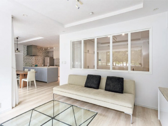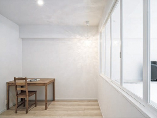 1LDKの間取りから、将来賃貸に出すことなどを考えて3LDKにリフォーム。広い寝室を2部屋に分け、さらにゆとりのリビングの中に大きな室内窓で光や風を取り込む個室をご提案しました。朝から電気を付けるほどだった暗さは、躯体ギリギリまで天井を高くし、内装を明るい白に統一して解消。以前より開放的なLDKになりました。