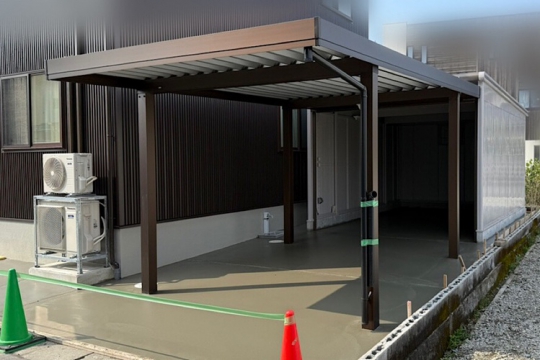 カーポートは1台用(YKKap ジーポートpro 30-55 カラー:ブラウン)を施工、ガレージは1台用(ヨドコウ ラヴィージュⅢ VGCU-3352H カラー:ダークウッド)を施工しています。