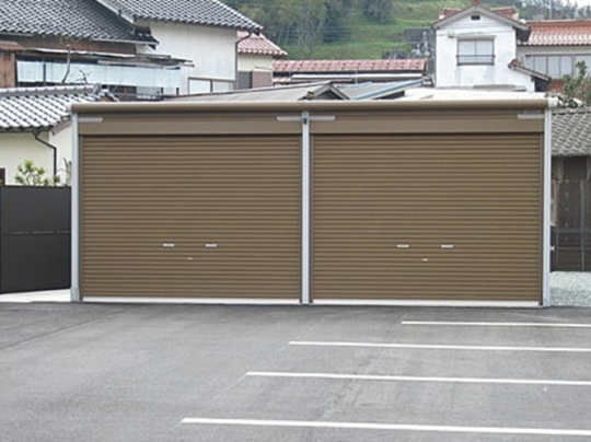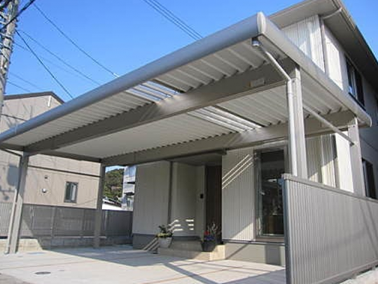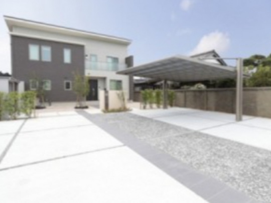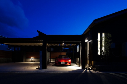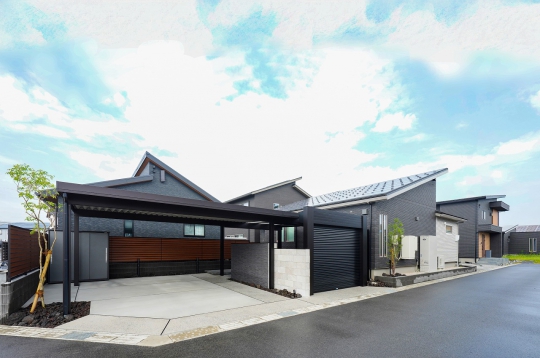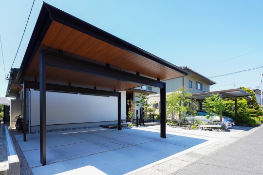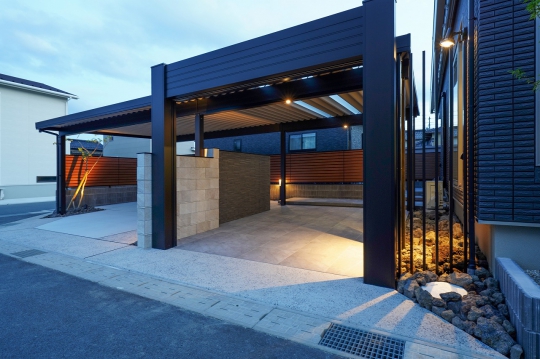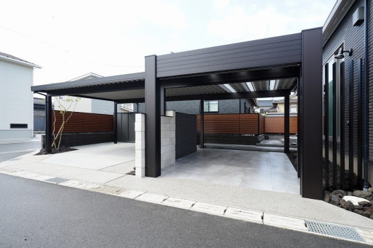 シャッターゲートとカーポートで空間をしっかりと仕切る、シンプルで重厚感のあるスタイル。