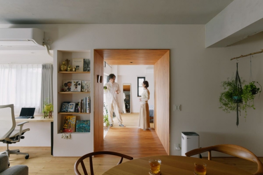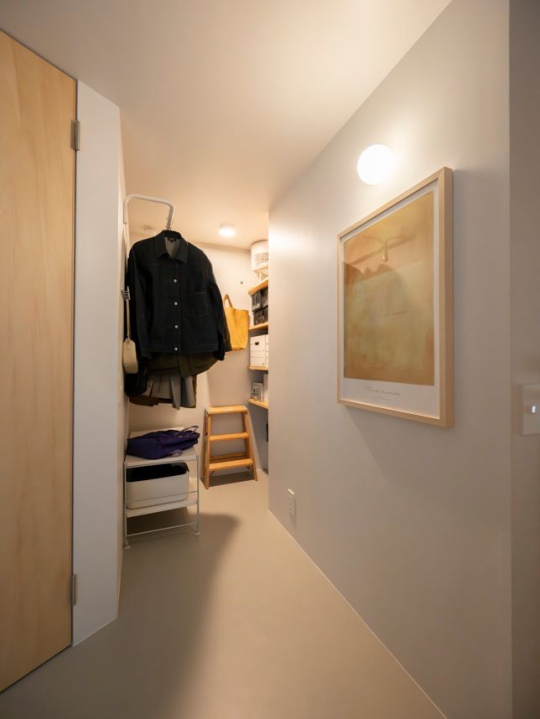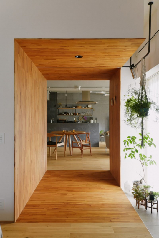 飾ることが好きな施主のために内装の素材感を活かしてさまざまな背景をつくりだし、ディスプレーのきっかけをデザインしました。リビングと寝室をつなぐ小空間にチーク材を貼ってトンネルのように仕上げることで、生活シーンを切り取る額縁のような効果を。