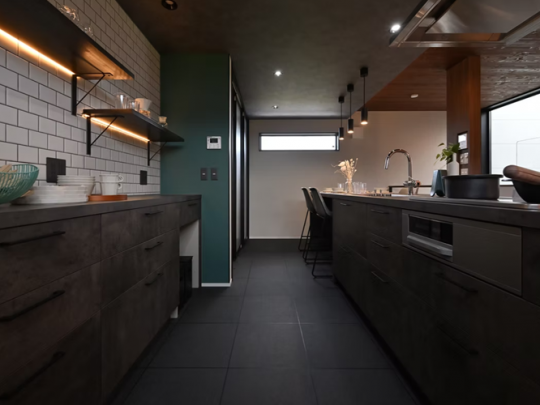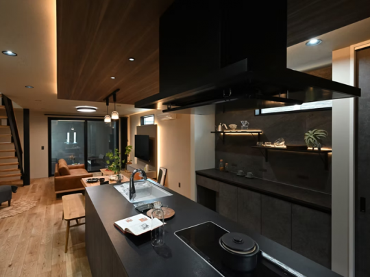 キッチンにはブラックカラーでスタイリッシュな最高グレード仕様のものを採用。