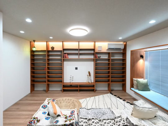 壁一面の本棚、出窓ヌック、キャットウォークを設置した1階リビングなど癒し空間が満載。