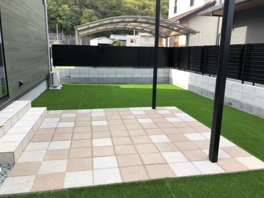 手入れがしやすく、家族みんなが快適に過ごせるお庭に仕上げました。 広々とした人工芝スペースは、お子様の遊び場やくつろぎの空間として活用可能。 テラス部分にはタイルを採用し、BBQやガーデン家具の設置にも最適です。 目隠しフェンスでプライバシーにも配慮しながら、開放感も確保したバランスの良い外構プランです。